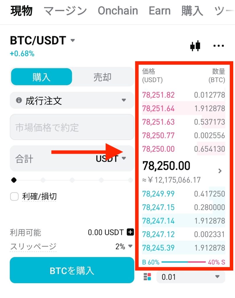 ピンク色と水色の数字が並んでいる部分です。ピンク(78,251.82など)が売り注文、水色(78,249.99など)が買い注文を表しています。