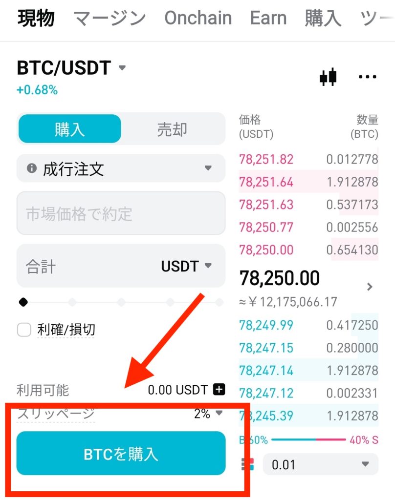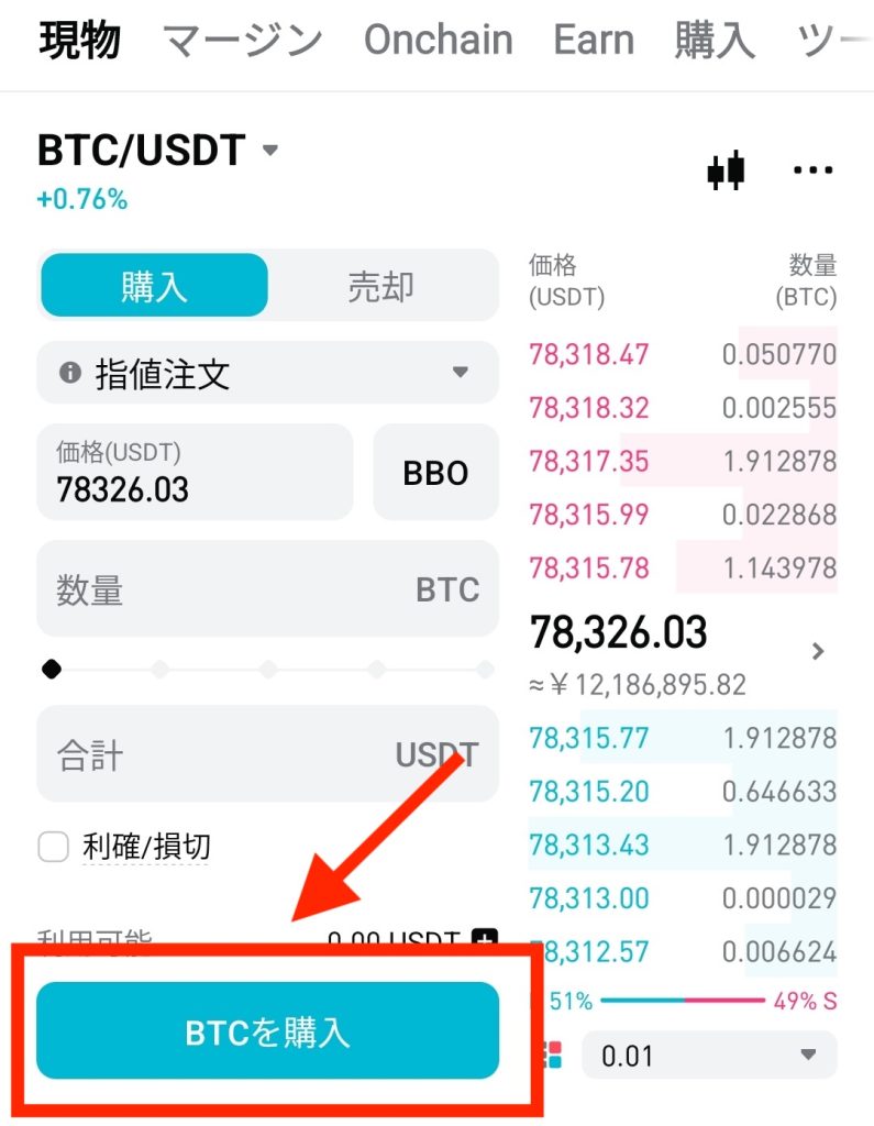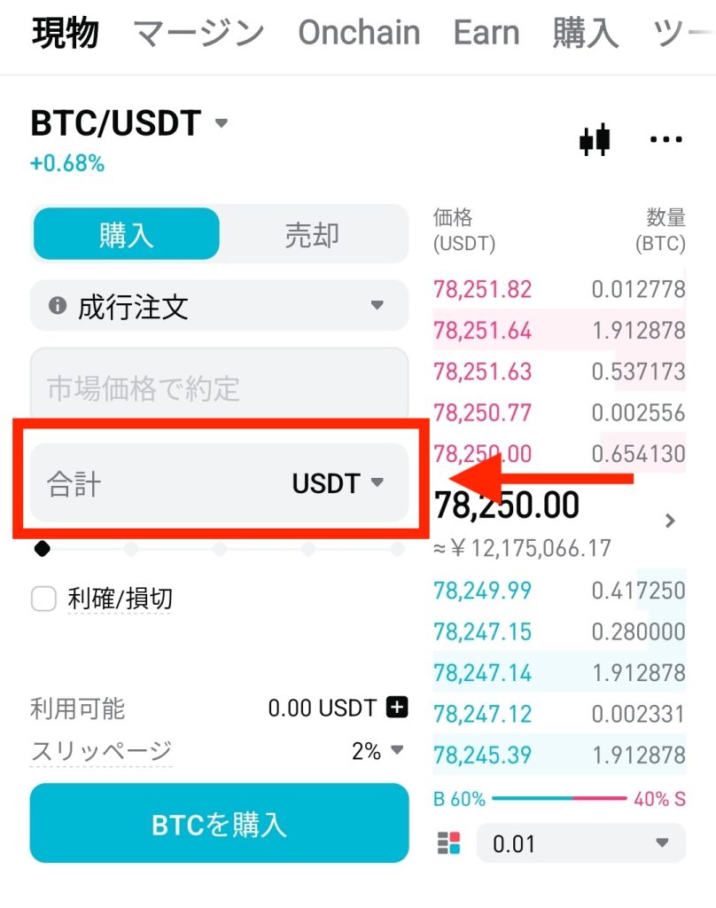 左側(BTC)が買いたい通貨、右側(USDT)が支払う通貨です。