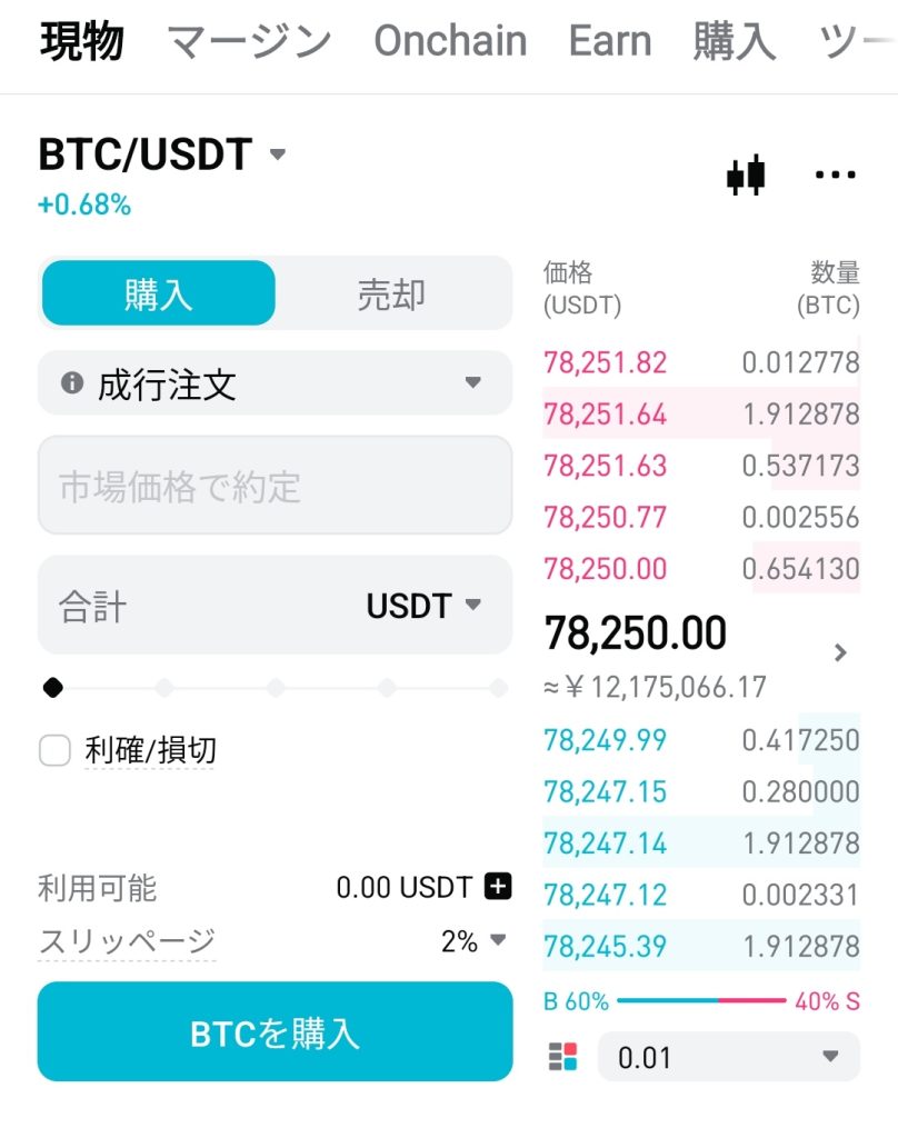 ※いきなり大金は不要です。まずはゲーム感覚で、画面の数字が動く楽しさを知ることからスタートしましょう。 - ステップ2: BTC/USDTで成行注文を試してみる