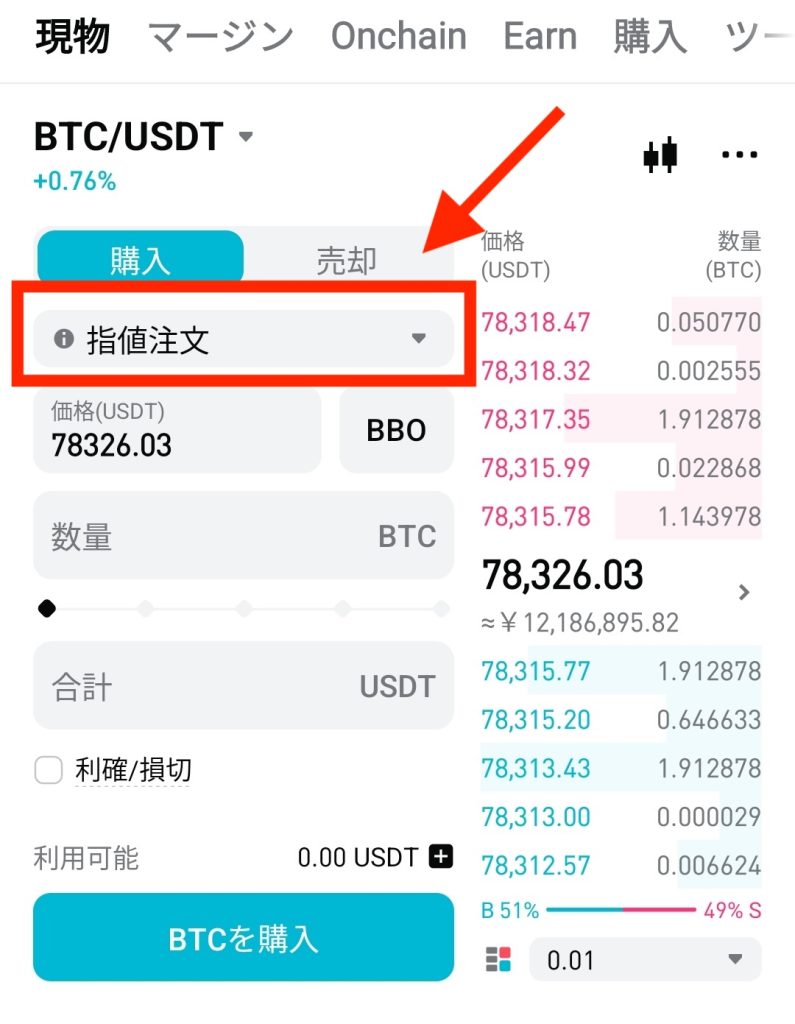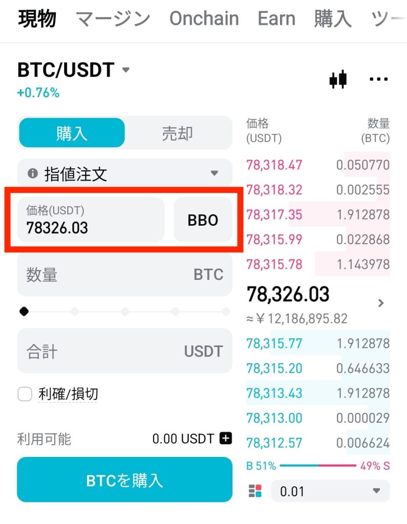 「価格(USDT)」欄に希望価格を入力(例:78326.03)。