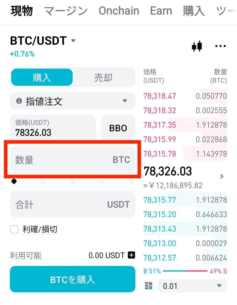 「数量」欄に購入したいBTCの数量を入力または「合計」欄にUSDTの金額を入力。